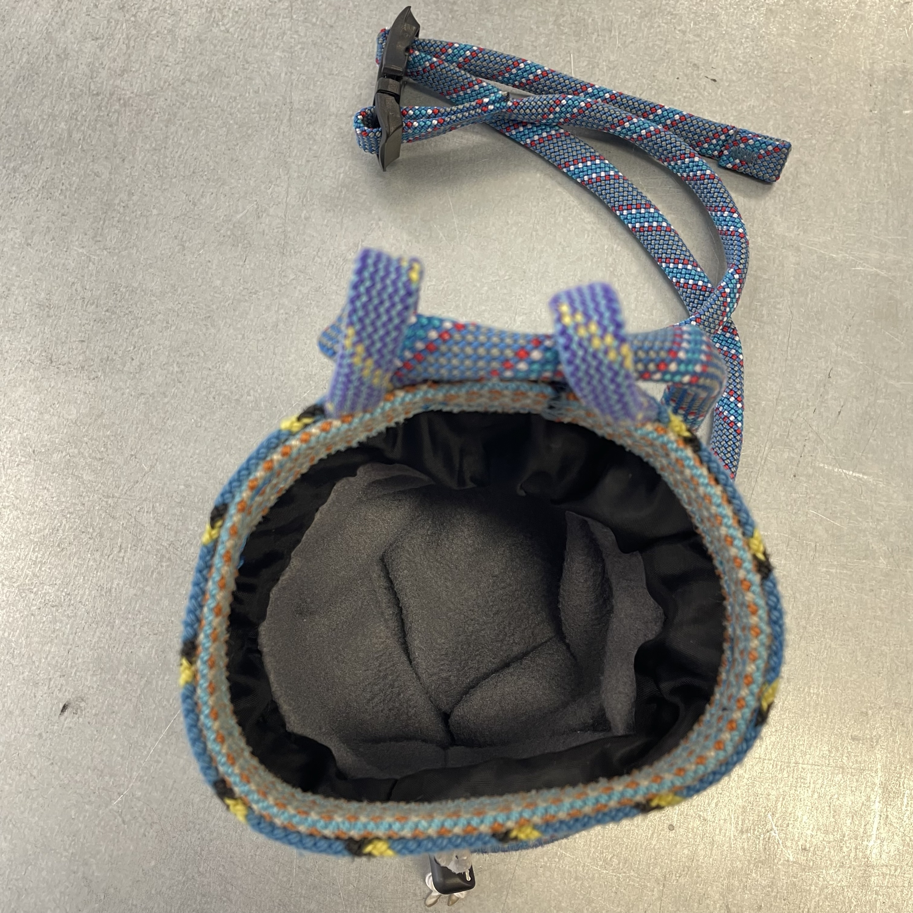 Denne unik, one of a kind, miljøvenleg kalkposen er laga av utslitne klatretau, forskjellige utslitne klesplagg, og smådelar frå ein ryggsekk. Dei einaste nye delane er auget, tråden og Upscalelogoen. Den har to gummistrikk til børster og kom med ei belte også laga av klatretau.