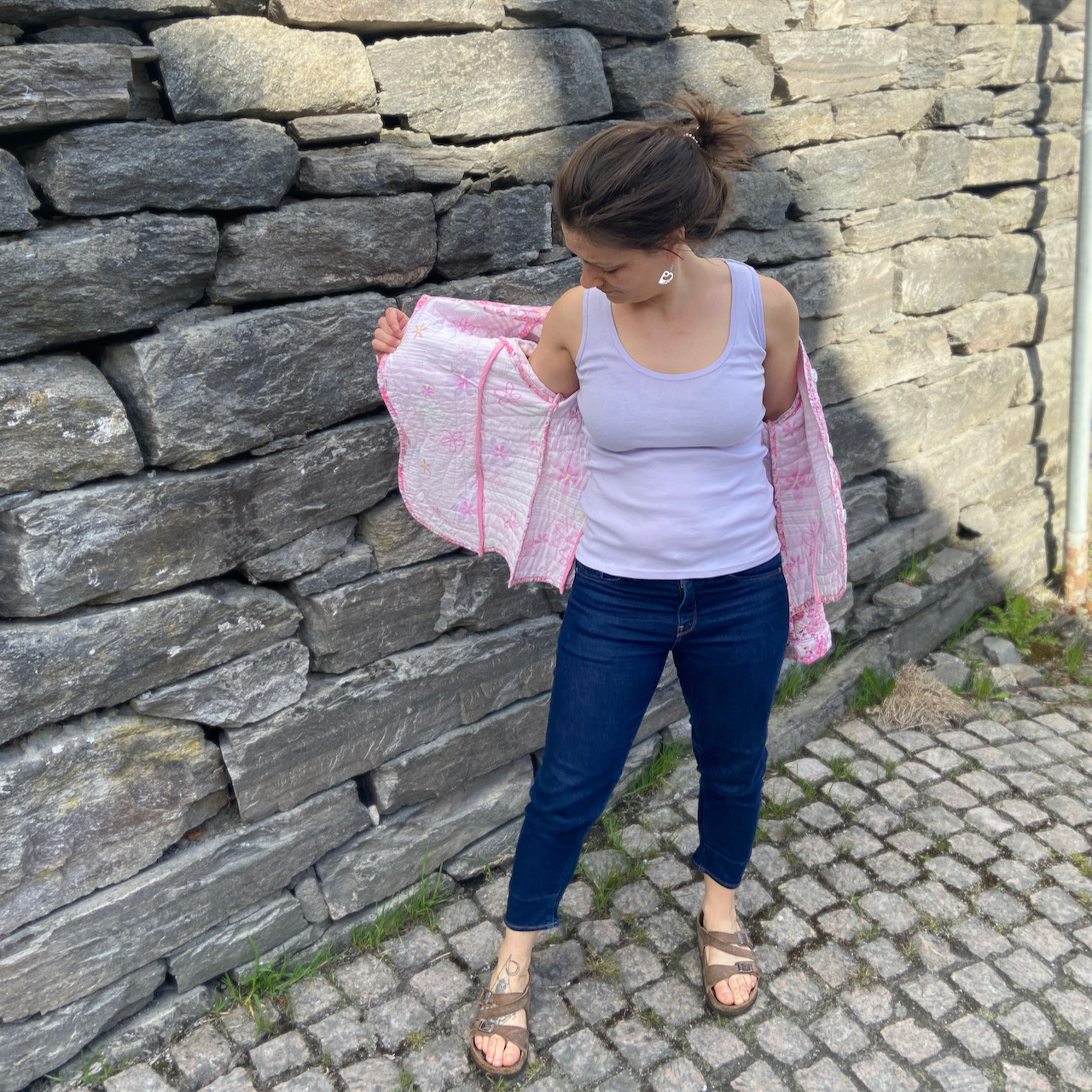 Då er jakka ferdig, og til sals. Den er ca. str. 38, og laga av eit quilta teppe. Eg beheldt dei fine bølgene frå det originale teppet, og har gøymt saumane på insida. Vintage knappar, lommer – alt ei jakke treng.