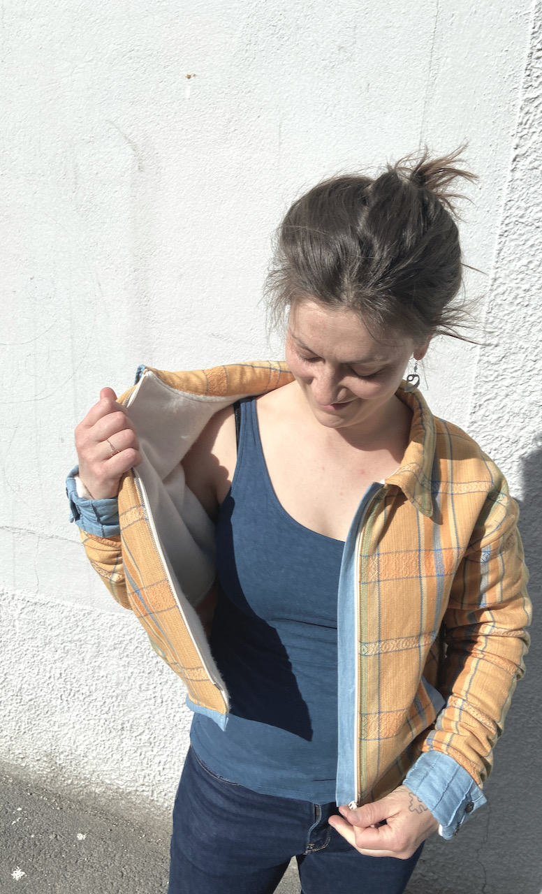 Det var ein gang ei relativt lite kul ulljakke som eg tenkte kunne trenge litt farge. Dermed tok eg ein rutete bordduk og ein øydelagd, blå kjole og sydde eit yttertrekk til jakka. No er den ganske fresh og passar perfekt til ein tidleg vårmorgon på terrassen, eller sein sommarkveld når sola har gått ned og stemninga har gått opp.